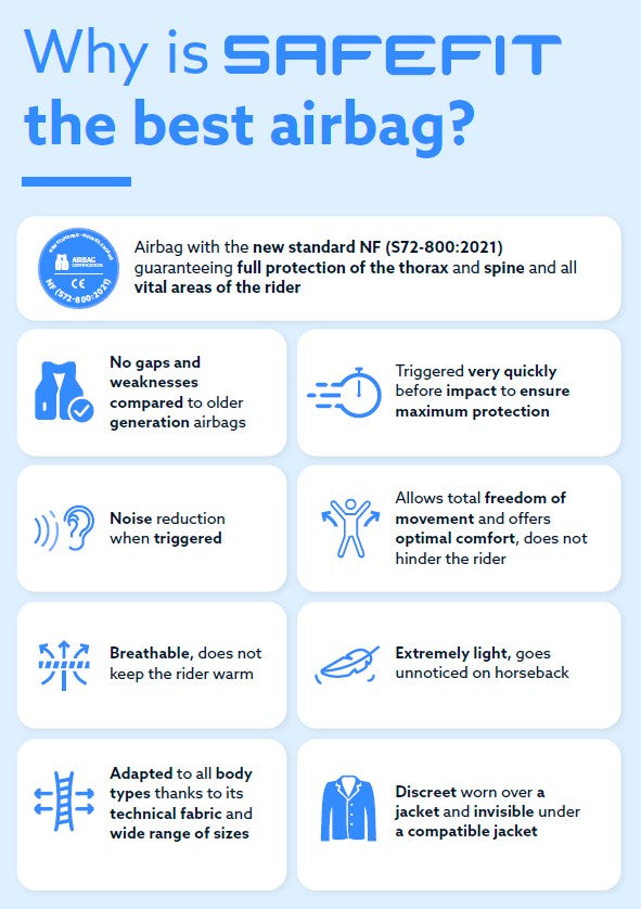 In the event of a fall, the SAFEFIT airbag vest ensures total protection of the vital areas of your body (neck, cervicals, thorax, back, rib cage, lumbar area, pelvis and sacrum) thanks to its ultra-fast triggering before impact.