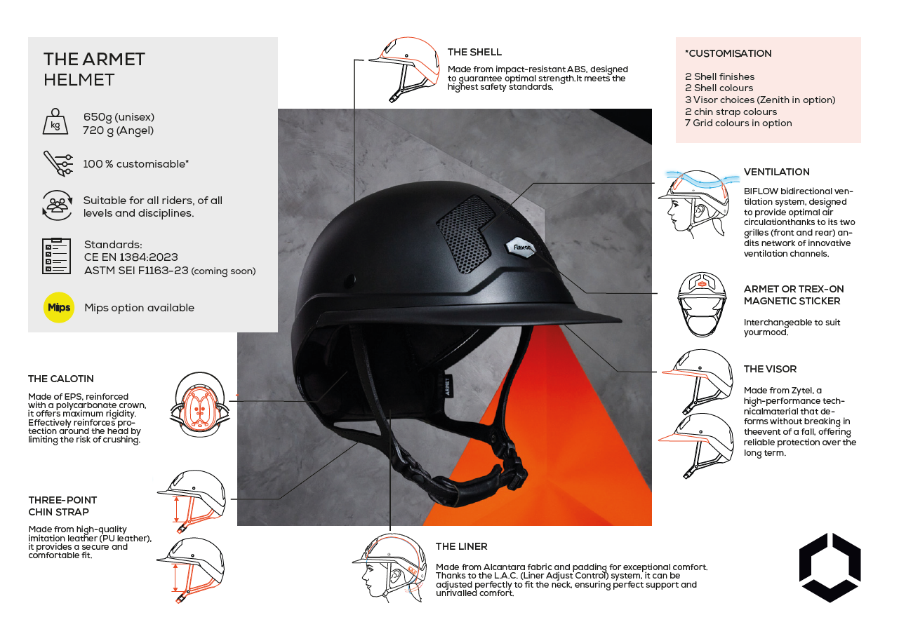 De Flex-on ARMET helm combineert geavanceerde veiligheidstechnologie met hoog draagcomfort en uitgebreide personalisatiemogelijkheden. De buitenschaal is gemaakt van slagvast ABS en gecertificeerd volgens CE EN 1384:2023. Dankzij de sterke maar lichte constructie biedt de helm optimale bescherming bij impact. Het gewicht bedraagt circa 650 g met Mixte klep en 720 g met Angel klep.