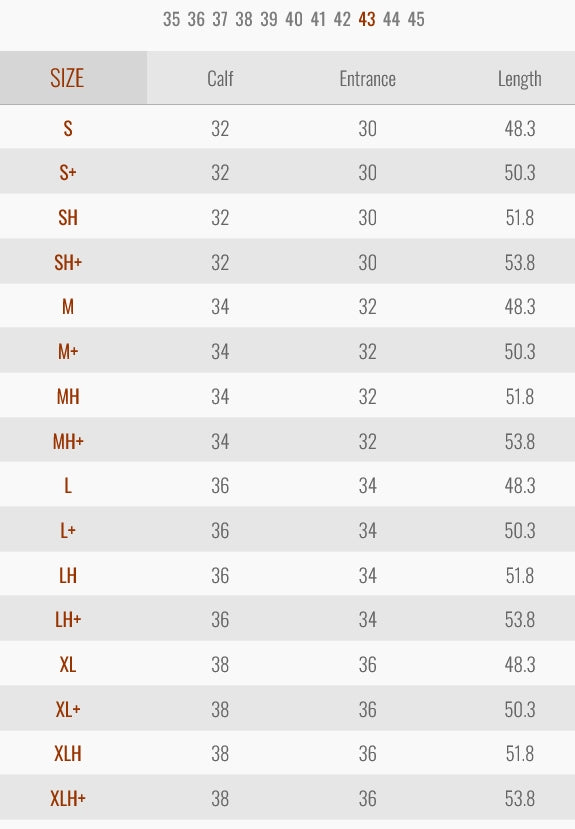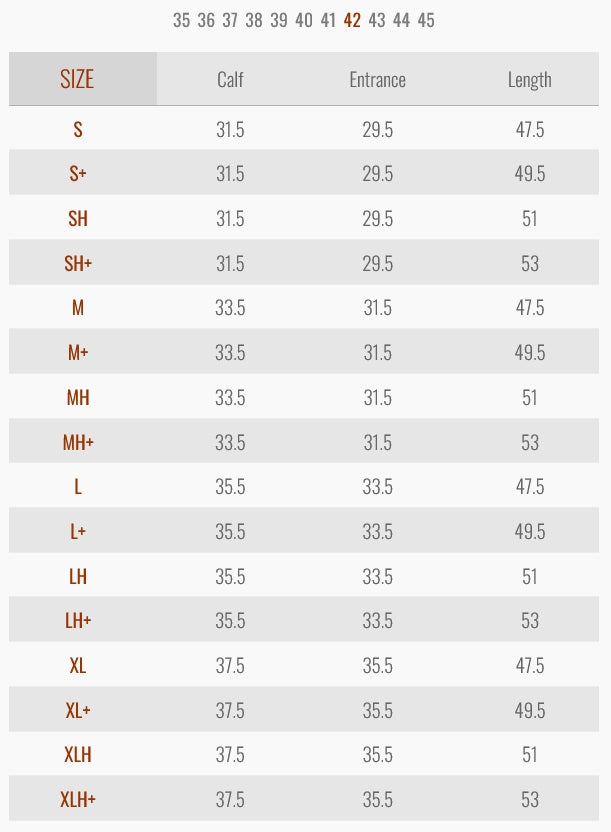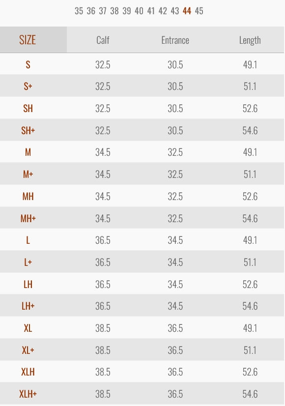 We are happy to help you determine the correct calf size. View this explanation to determine the size and then look in the size chart for the correct size. Contact us without obligation or come and try on the boots in our store.