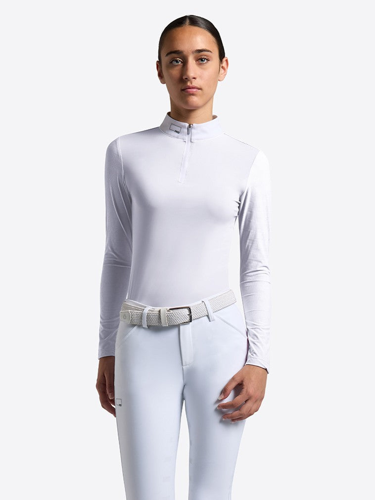 The Rider's Gene girls long sleeve competition shirt is designed to provide both comfort and style during competitions. Made of technical jacquard fabric, it offers a close and breathable fit, ensuring freedom of movement and optimal temperature regulation. The high collar adds a refined touch, while the Rider's Gene logo details enhance the distinctive design. Perfect for riders looking for a functional and stylish garment.