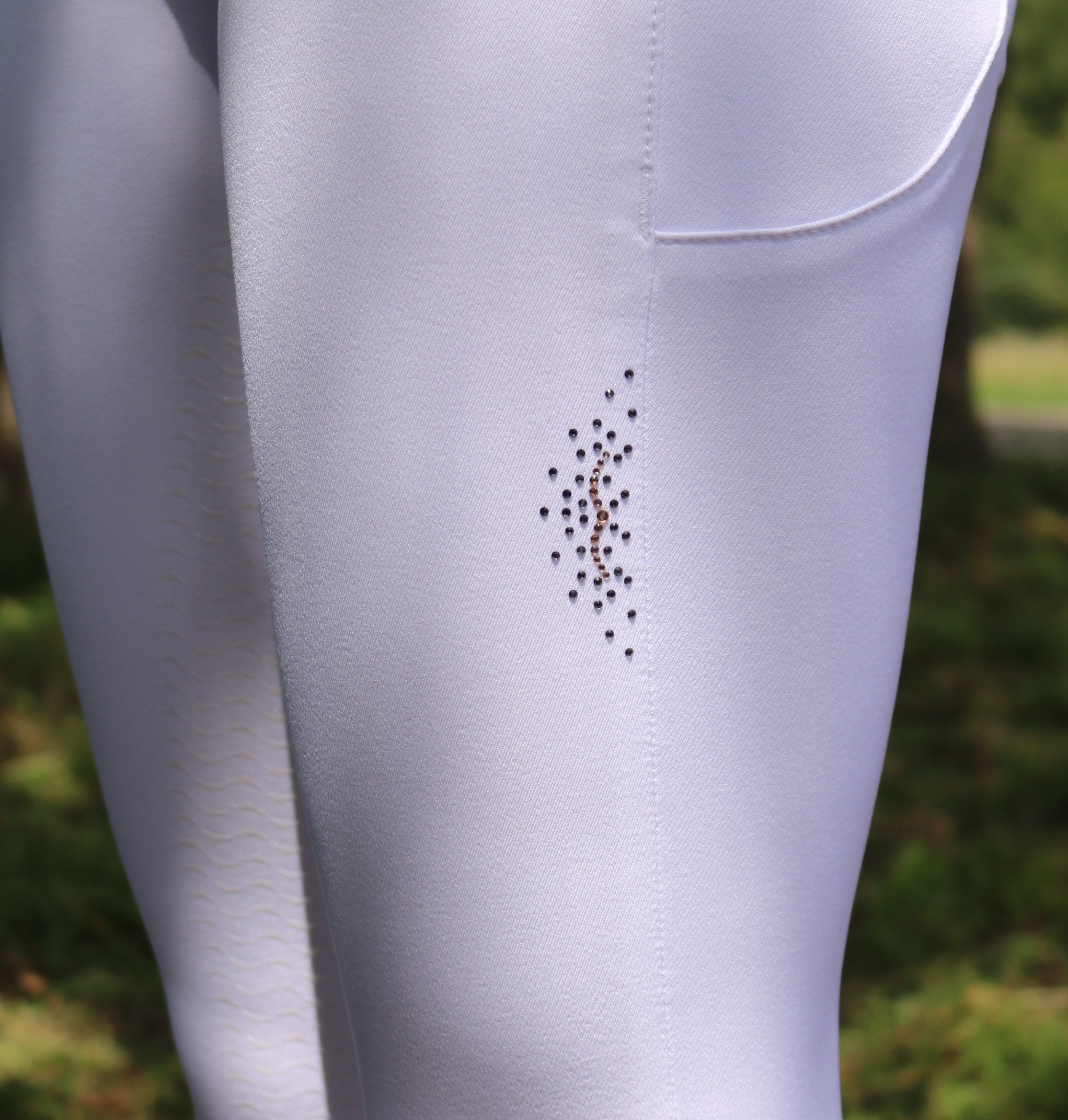 High waisted women's trousers with knee grip, made of Esprit fabric. The waist has a double button closure. The silicone strip inside the waistband keeps the shirt tucked in. Items made of Esprit fabric fit like a second skin, which ensures breathability and natural regulation of body temperature. The close-fitting fit enhances the silhouette. Push-up effect. Albatross logo in rhinestones on the left leg. "Effortlessly Innovative" design.