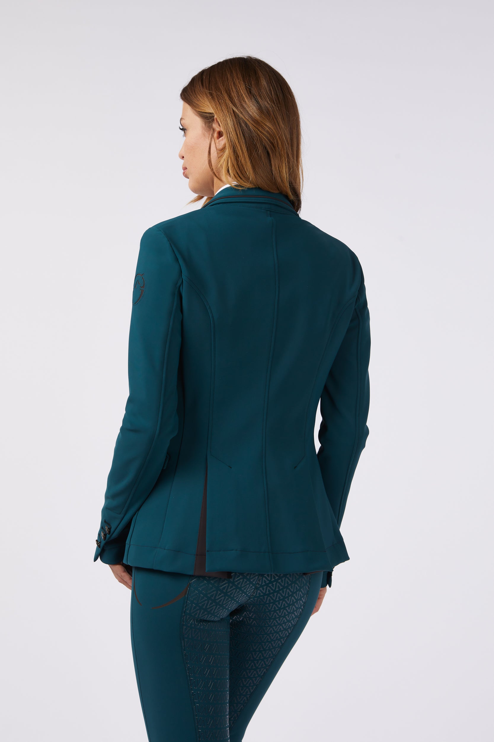 Canberra jacket is an unlined women’s competition jacket, Canberra is a high-end classic one. The knitted fabric is perfect for competitions. At the same time, it’s soft enough to guarantee freedom of movement for every body shape, including curvy ones. Contrast alcantara details, personalized rib recalling the Stable’s colors. Laser logo on shoulder. All materials are durable and strong.