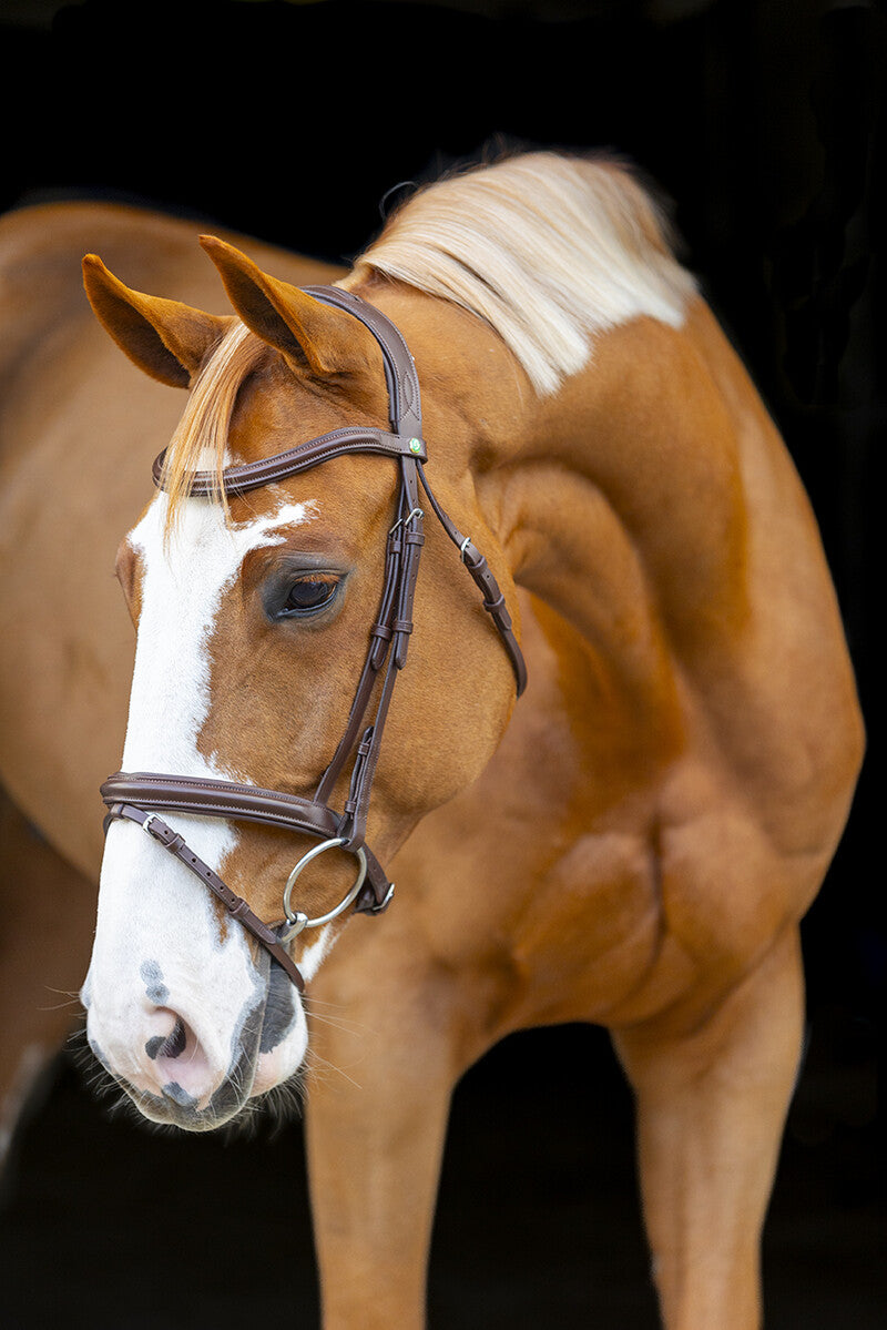 Bridle with anatomical headpiece in an excellent price/quality ratio! The Classic Touch bridle is made of sturdy yet very supple buffalo leather. The browband is formed in a slight V-shape. The bridle has blind closures at the cheek pieces and reins. The bridle comes with anti-slip reins with leather stoppers.