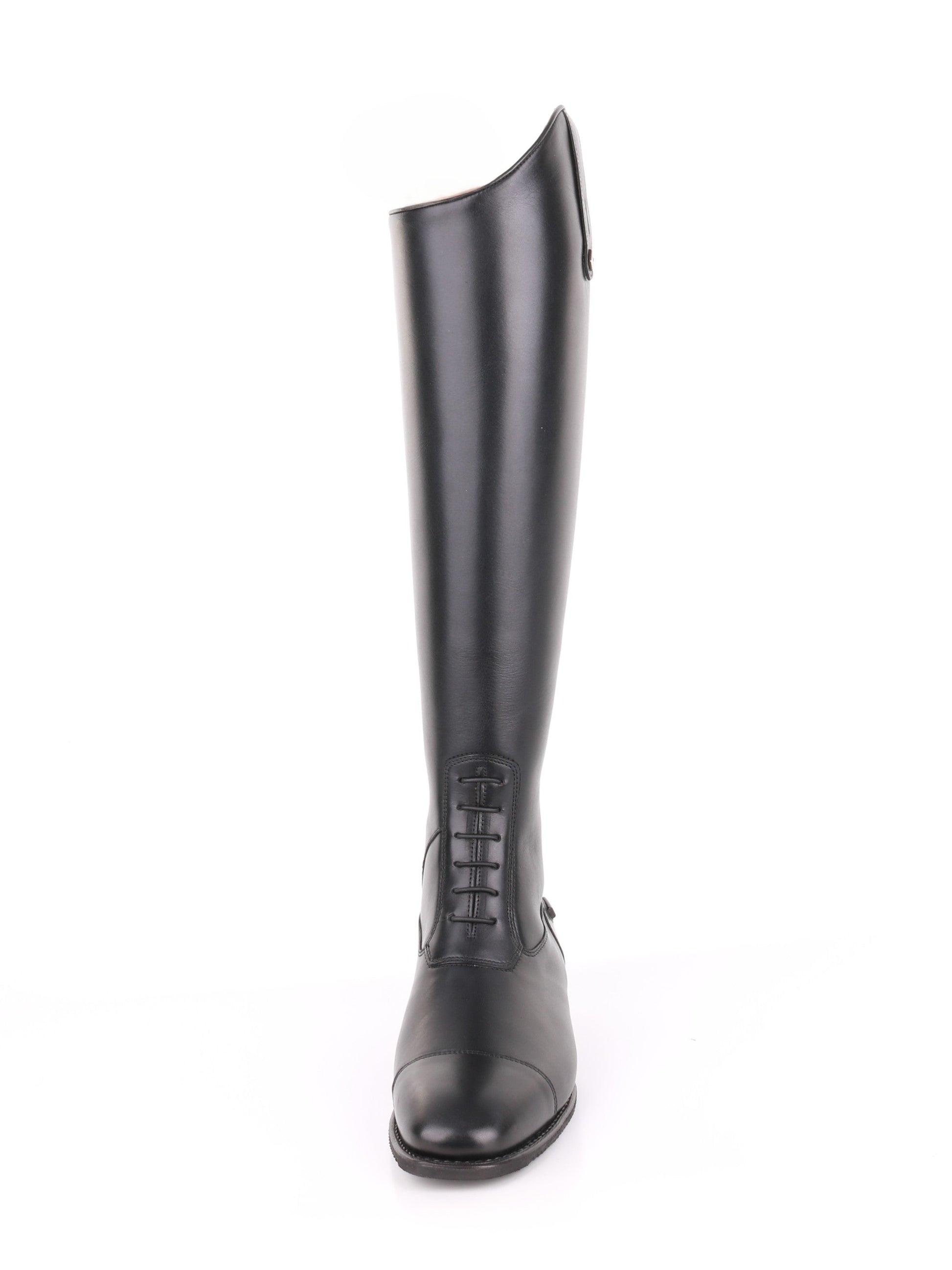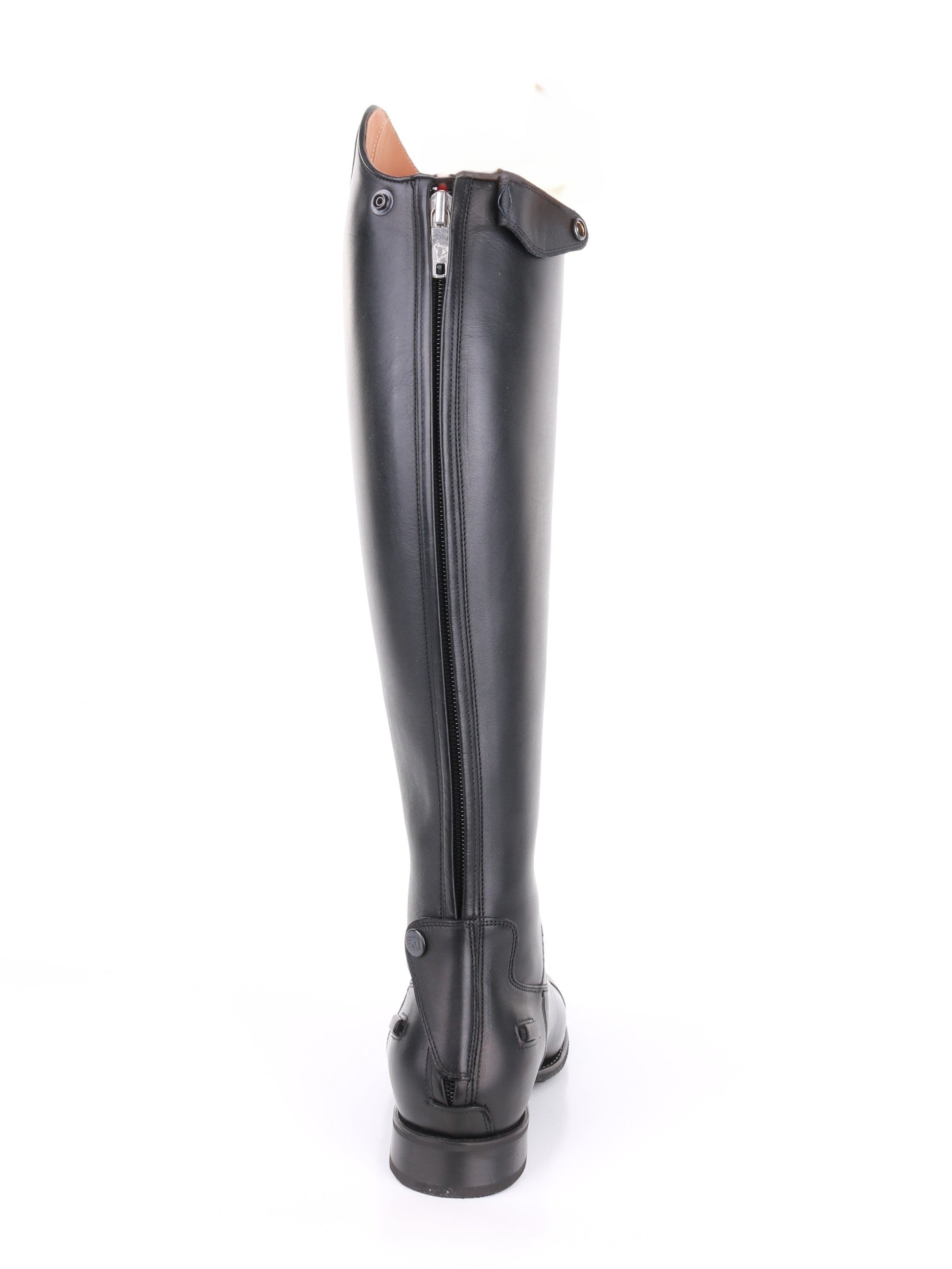 This boot also features laces at the front of the instep and a zipper at the back of the leg, finished with two zipper guards (top and bottom). The riding boot also features spur guards.