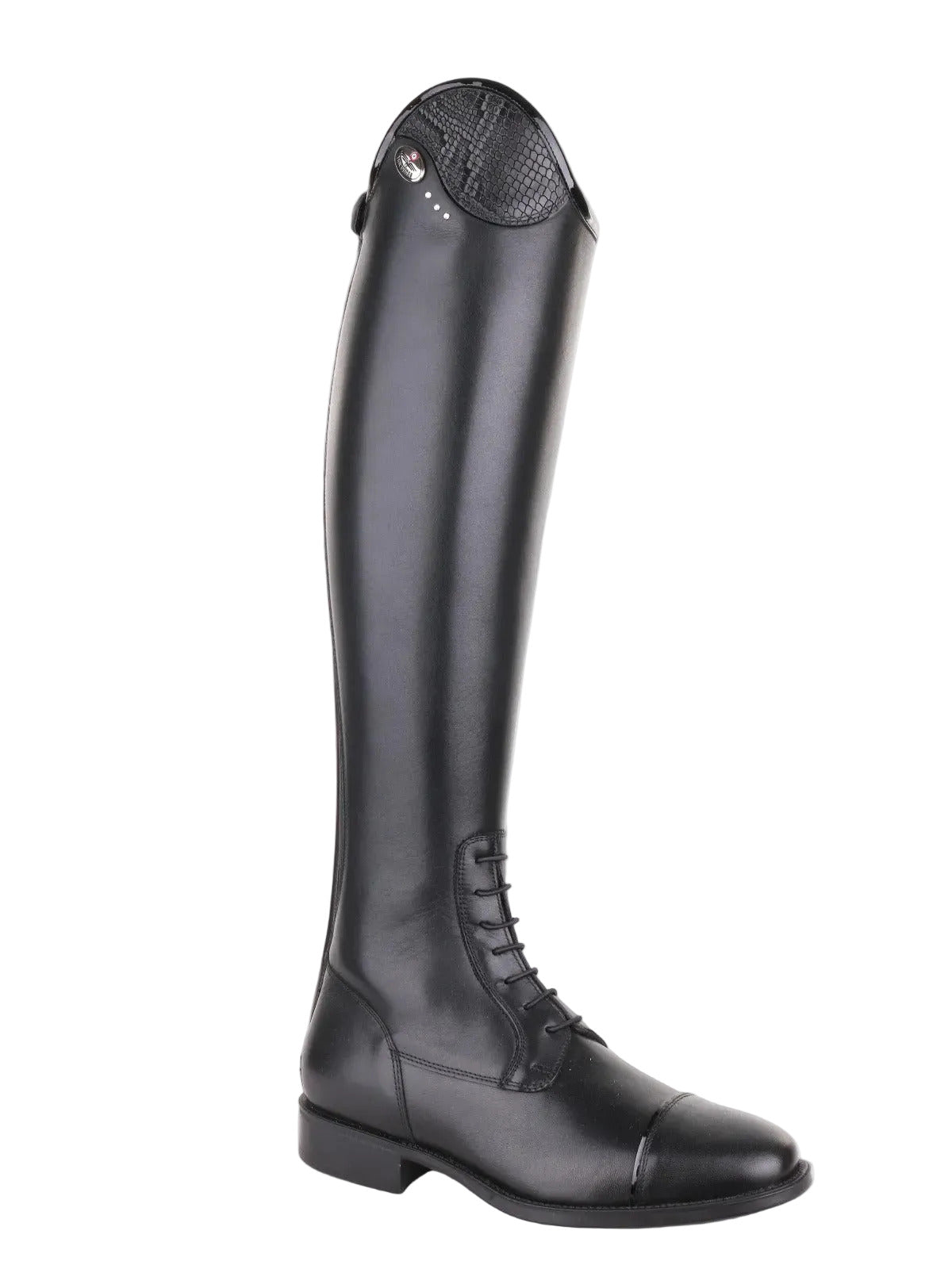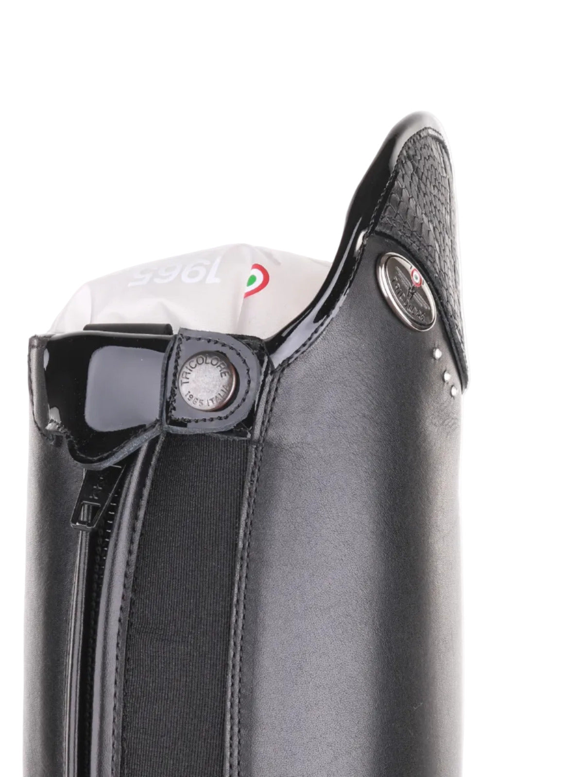 The Tricolore Salentino Custom Smooth Black riding boots are an elegant and refined custom version with great attention to detail. These boots are crafted from Smooth Black leather (Salentino/02), offering a timeless and sleek appearance. The Patent Black pipings add a subtle glossy accent along the lines of the boot, while the Glitter Black top and SW Crystal details provide a luxurious and stylish finish.