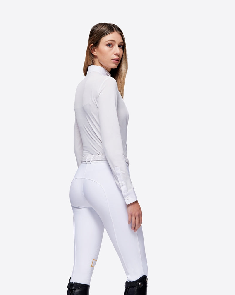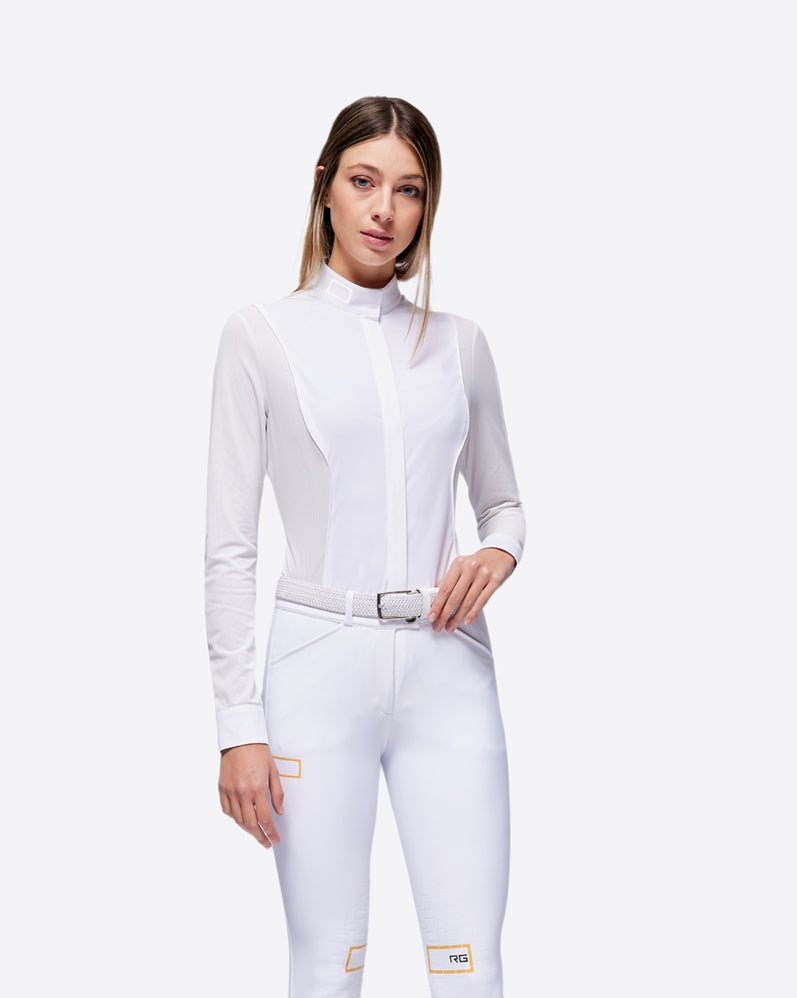 The RG competition shirt for women in Jersey and Mesh provide an elegant yet sporty look. The typical poplin collar embellished with the RG logo together with the innovative front design give the garment fit and freedom of movement.