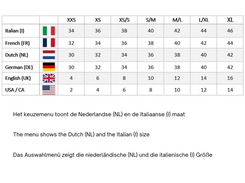 - Important: we deliver the French size. This is also the size on the label in the jacket. See the size chart for translation to other sizes.