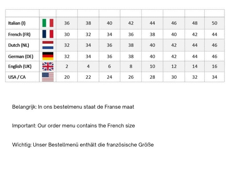 - Sizes: FR32, FR34, FR36, FR38, FR40, FR42